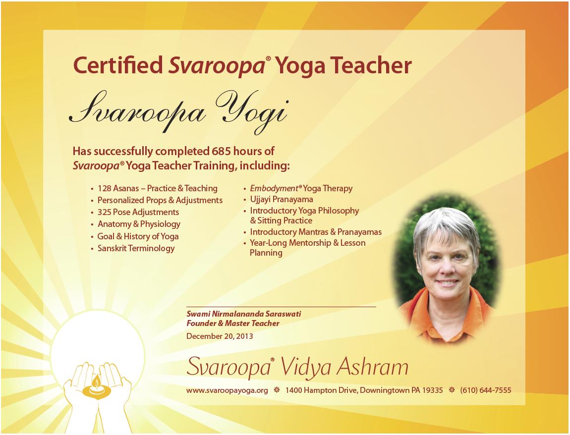 So I didn’t see the point of an upgrade. Yes, I knew Swamiji was now empowered to empower us meditation teachers to teach from the updated Mantra Syllabus and offer to our students the mantra from her Baba — Swami Muktananda. But I had no idea of the power of this change — until my local Svaroopa® sister Karuna (Carolyn) Beaver returned from her MTT; it was the first MTT immersion based on the Mantra Syllabus. To support Karuna in her MTT homework, I signed up for her series. And, as they say, the rest is history. My experience meditating with the new mantra propelled me deeper than I ever imagined, clearly into profound levels that had I had perhaps glimpsed before or had only heard about.