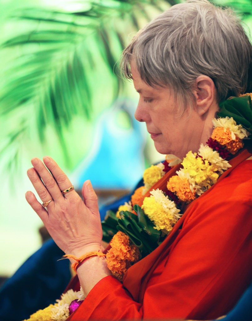 It’s a simple equation. The more yoga I do, the better I feel. My body doesn’t hurt as much, and I’m nicer to those I live with. I have more energy, and I want to spend more of that energy helping others. Yoga poses, meditation and studying with Gurudevi Nirmalananda has impacted my body, mind and heart. That leads to my devotion, both to the practices and the teacher who gave them to me.