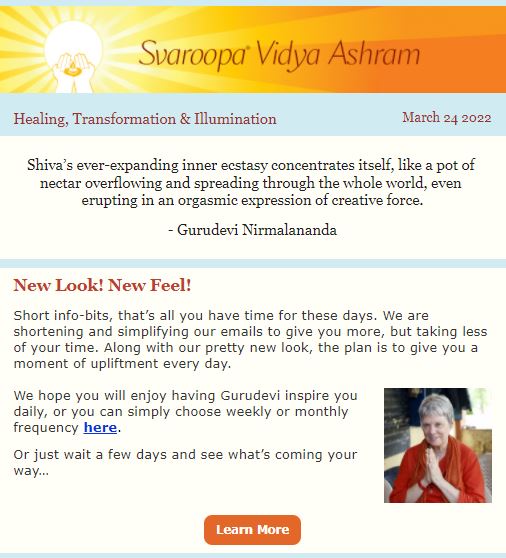 During Shaktipat, I felt an energy go into me. It was extraordinary. It felt like a faucet had turned on at the base of my spine. It brought me inside to my Self. When I returned home, everything there was the same, but I had changed. — Robin B.