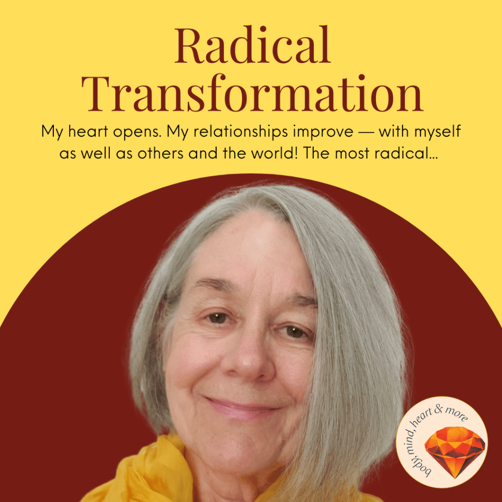 My heart opens. My relationships improve — with myself as well as others and the world! The most radical shift has been in what I want. While I did get teaching Svaroopa® yoga and meditation as my life’s work, I got more. I got “ME.” This is the experience of the One Self Being All. In the beginning, I had a vague awareness that was what I longed for. Now it’s clear. What I’ve always wanted is to be rooted in Self.