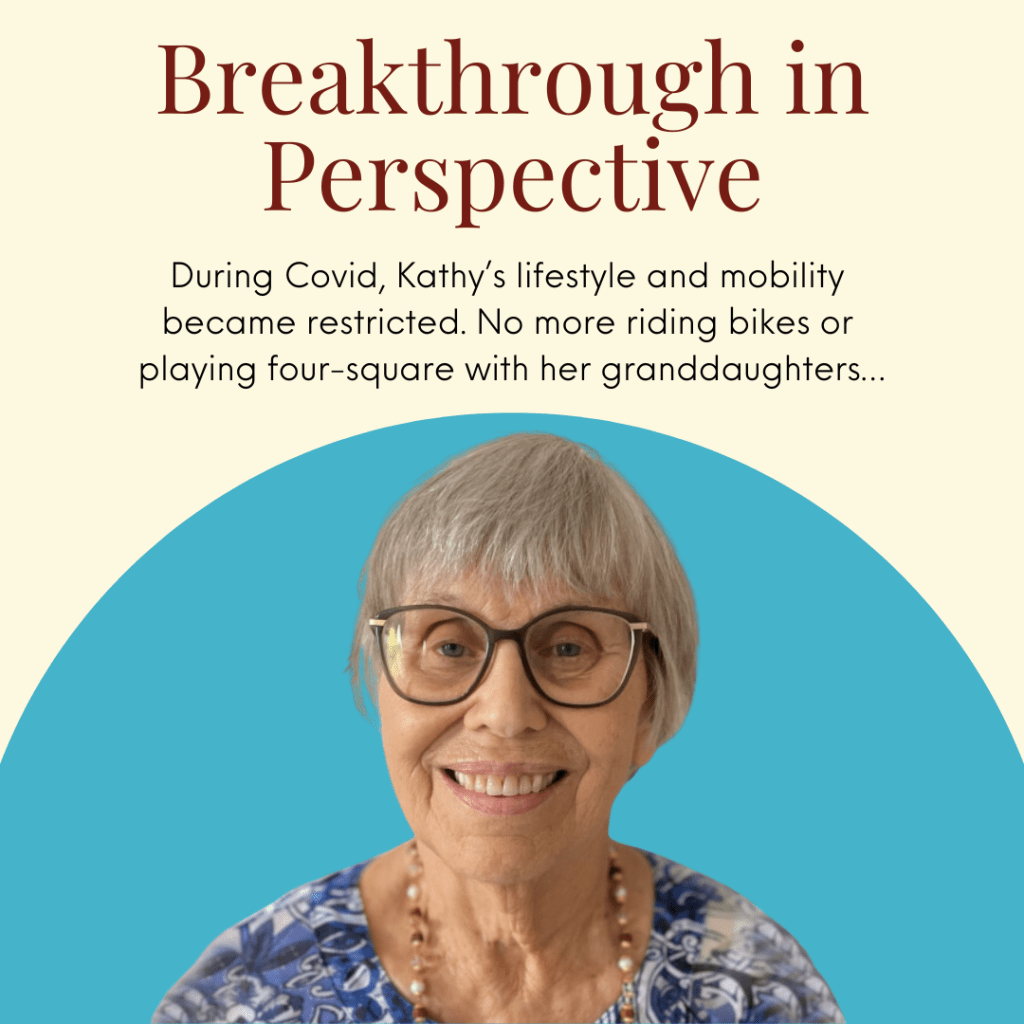 During Covid, Kathy’s lifestyle and mobility became restricted. No more riding bikes or playing four-square with her granddaughters. She could no longer even walk to the end of her driveway safely unless she used walking sticks.