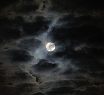 Shining in the dark, the moon reflects the light of the sun. It is cooling, luminous light showing your way through the mounded shapes in the night.