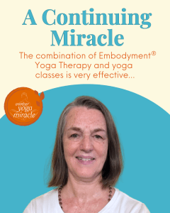 She is leaning into all the poses more deeply. Her Lunges are more extended. She’s taller and more lengthened through her rib cage in Seated Side Stretch. She has more ease in doing poses that were challenging before. And she’s a stellar example of coming to class, getting settled in Shavasana and immediately turning inside. The combination of Embodyment® Yoga Therapy and asana classes is very effective.
