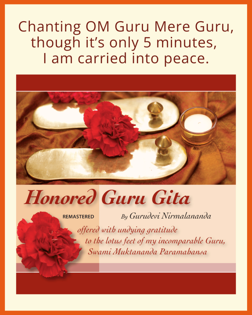 In Verse 1, you repeat the first line “OM Guru, OM Guru.” It stems from the mantra Guru OM, which Muktananda received from his Guru, Bhagawan Nityananda. Muktananda gave this mantra to Gurudevi, and she shares its Grace with us.