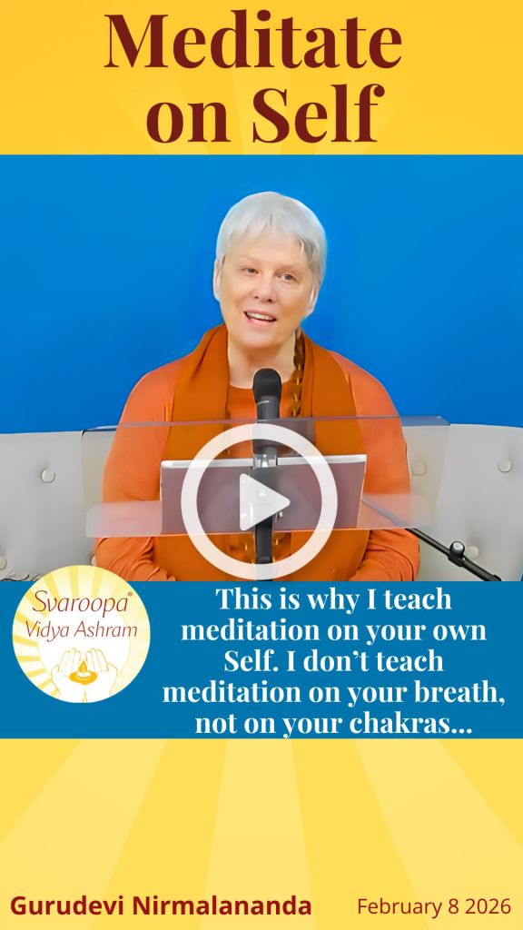 This is why I teach meditation on your own Self. I don’t teach meditation on your breath, not on your chakras, not on God, or Gods or Goddesses, not on success or happiness. I remember one woman came to Baba and asked for a husband. Baba told her to meditate on Self for happiness. So, she went to a different Guru and got…
